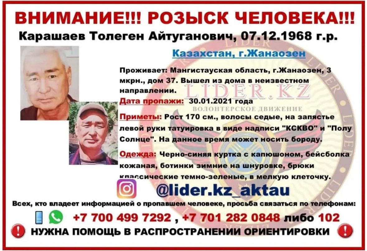 Толеген Карашаев, 1968 года рождения, житель Жанаозена. Пропал 30 января 2021 года. Мужчина вышел из дома №37 в 3 микрорайоне и ушел в неизвестном направлении. Рост – около 170 сантиметров, волосы седые. На левом запястье имеются татуировки с надписями «КСКВО» и изображением «полусолнца». В настоящее время может носить бороду.