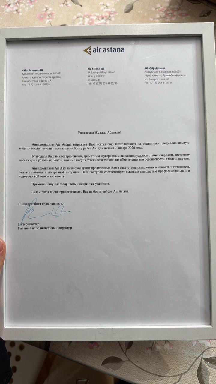 За оперативную помощь при внештатной ситуации на борту Жулдыз Абдикан получила благодарственное письмо от главного исполнительного директора Air Astana Питера Фостера.