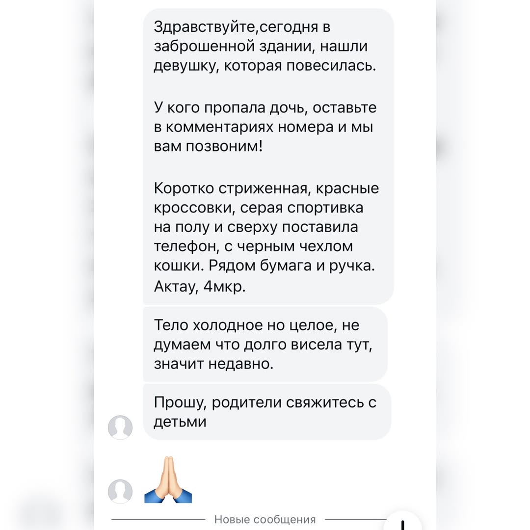 В одном из городских Instagram-пабликов Актау анонимный автор от имени сообщества волонтеров сообщил, что сегодня, 9 апреля, в одном из зданий 4 микрорайона была найдена повешенной молодая девушка, возможно, еще подросток. Пользователям предложили проверить, где находятся их дочери, так как о розыске никто не сообщал.