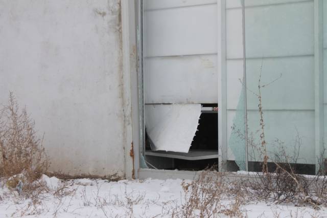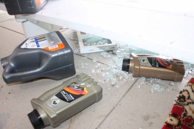 Злоумышленники разбили закалённое стекло панорамного окна на обратной стороне павильона, рассказывает владелец магазина. Отогнув металлическую панель, воры проникли в помещение.