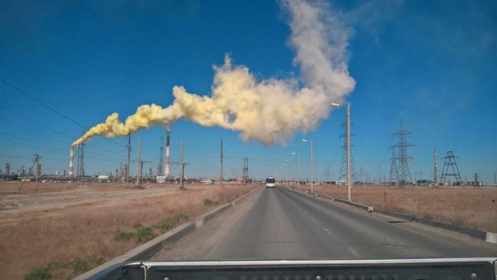На видео очевидцы запечатлели желтый дым, который идет из трубы на месторождении Тенгиз. По версии очевидцев, это может быть сероводород. Работников месторождения, как сообщают свидетели, эвакуировали.