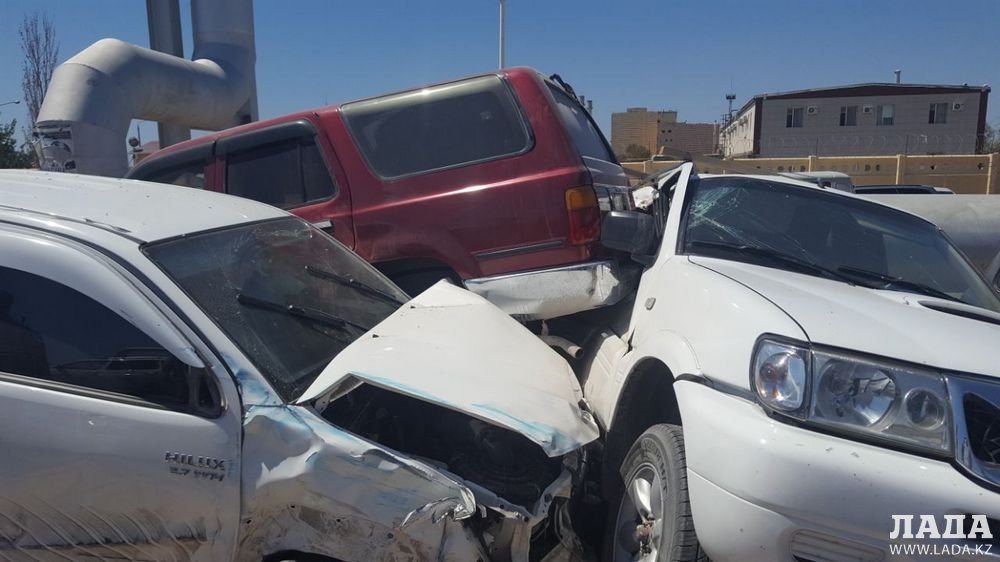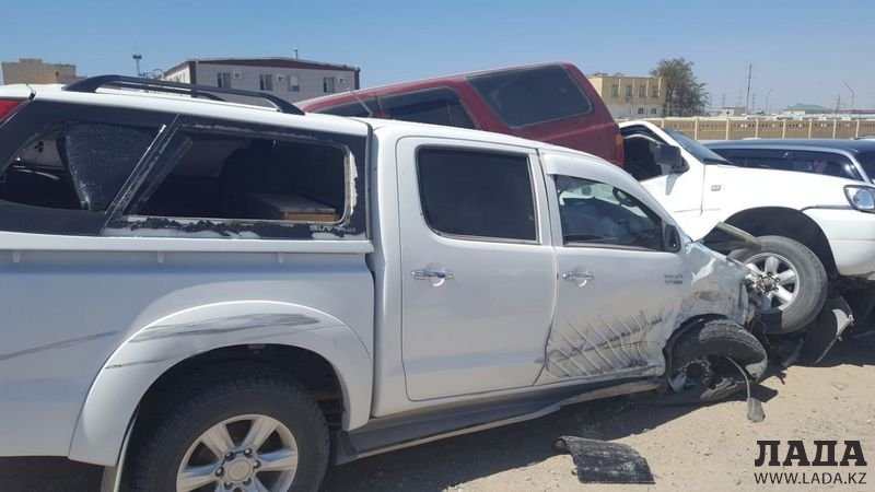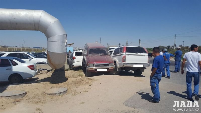 Авария, по словам очевидца, произошла сегодня, 11 августа, примерно в 14:20. Водитель Toyota Hilux, столкнувшись на главной дороге с бензовозом, вылетел на обочину и врезался в автомобили, припаркованные у въезда в управление автомобильного транспорта ТОО «МАЭК-Казатомпром».