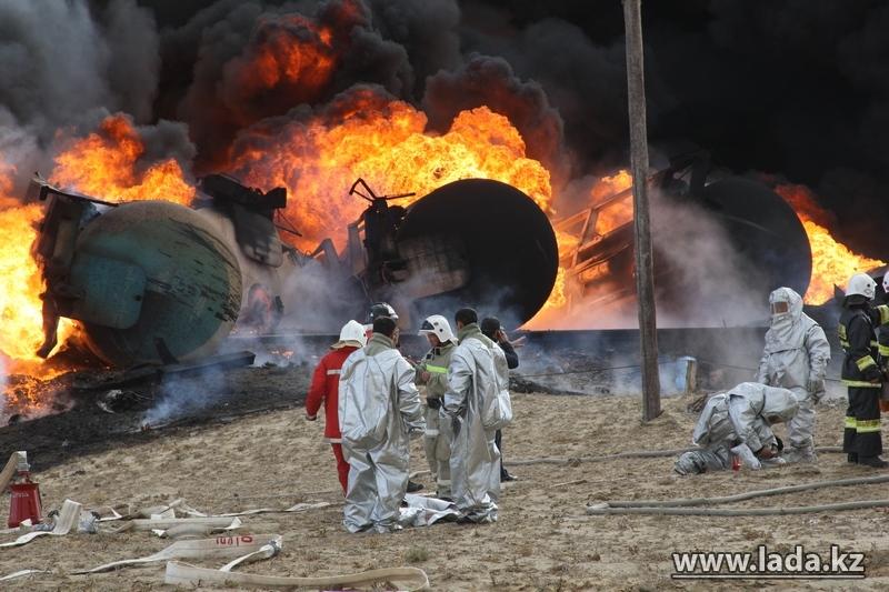 произошла 16 ноября в 11:55. На железнодорожном переезде, в пяти километрах от станции Мангышлак, столкнулись грузовик и товарный железнодорожный состав, перевозивший сырую нефть. В результате столкновения 20 цистерн опрокинулись. Произошло возгорание 17-ти из них. Машинист тепловоза получил травмы, его помощник погиб.