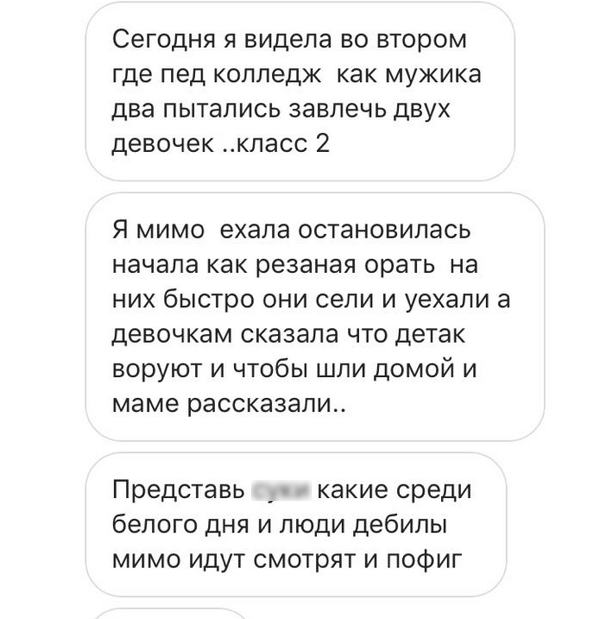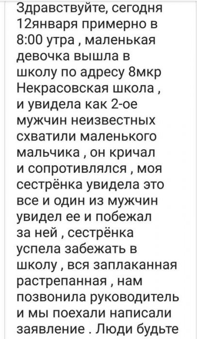 - Дочка, как обычно, в 08:00 вышла из дома и у дома №13 увидела, как двое мужчин в черных куртках с натянутыми капюшонами схватили маленького мальчика. Мальчик вырывался, кричал, сопротивлялся. В этот момент один из мужчин, увидев мою дочь, стал звать ее и направился в ее сторону. Тогда дочка побежала быстро в школу. Он бежал за ней и вслед кричал что-то угрожающее. Ей повезло, что возле школы находились взрослые, и мужчина развернулся и убежал в сторону 13 дома. Она забежала в школу и все рассказала классному руководителю. После чего уже позвонили мне и вызвали в школу, так как моего ребенка просто трясло от страха. Я сразу же вызвала участкового и вместе с ним направилась в УВД. Заявление я не написала, так как в полиции объяснили, что факта преступления не было. Но пообещали разобраться. В субботу и сегодня я видела, как полицейские патрулировали возле 9 и 10 домов, - рассказала Оксана, мама второклассницы.