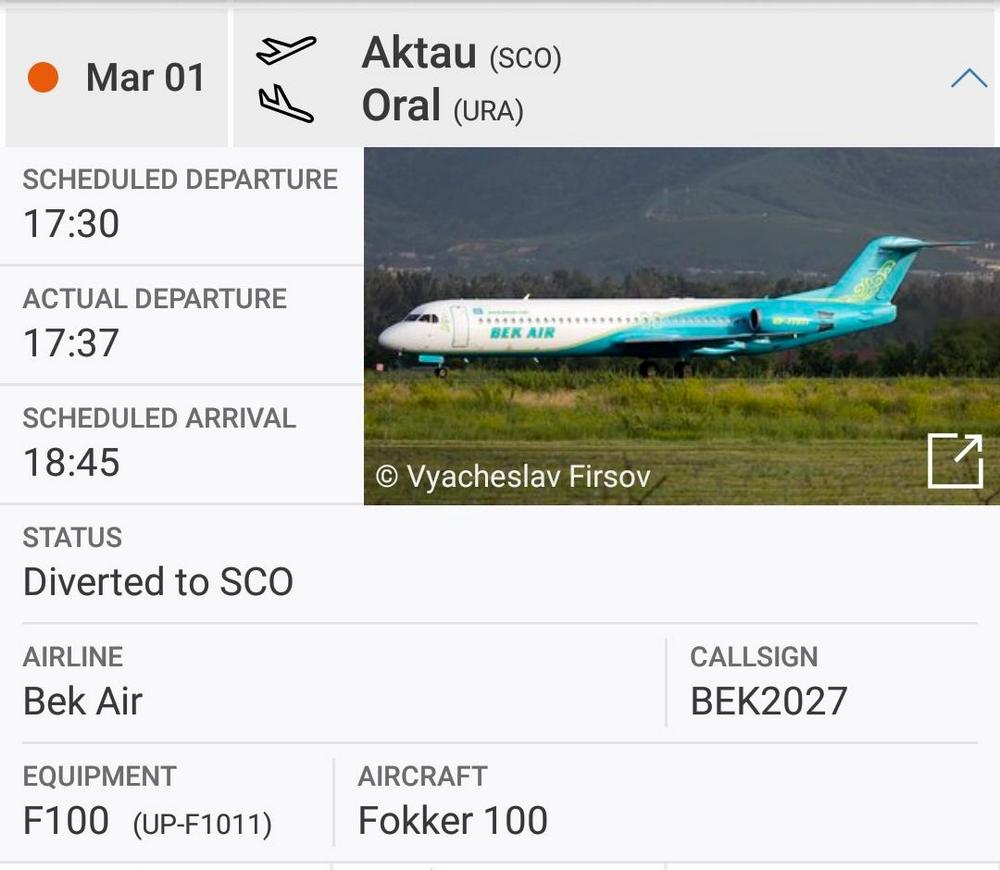 Инцидент произошел 1 марта. Согласно данным сервиса flightradar24.com самолет Fokker 100 авиакомпании «Bek Air», выполняющий рейс Z92027 Актау - Уральск, произвел взлет из аэропорта Актау в 17:37 и приземлился в аэропорту Актау в 18:17 местного времени.