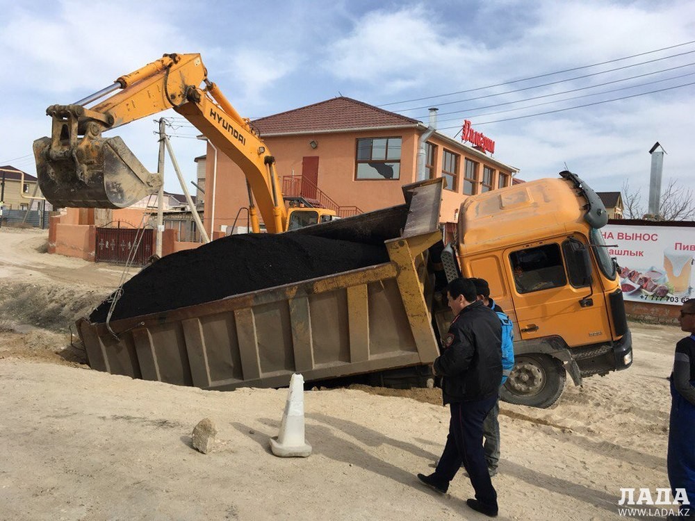 Грузовой автомобиль упал в яму примерно в 15:30 сегодня, 20 марта. На этой улице, как рассказали рабочие, укладывали асфальт.