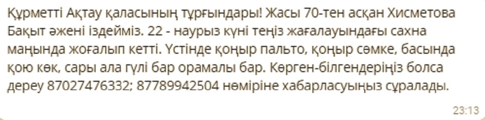 - Сегодня, примерно в 15:30, потеряли маму на набережной 15 микрорайона. Во время народных гуляний она потерялась в толпе. Была одета в коричневое пальто, на голове синий орамал (платок), в руках - коричневая сумка. Просим связаться с нами всех, кто располагает любой информацией, - говорит Орынгуль Хисметова.