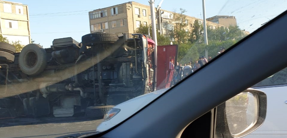В Актау на перекрестке автодороги между 8 и 10 микрорайонами произошла авария, в результате которой перевернулся спецтранспорт.