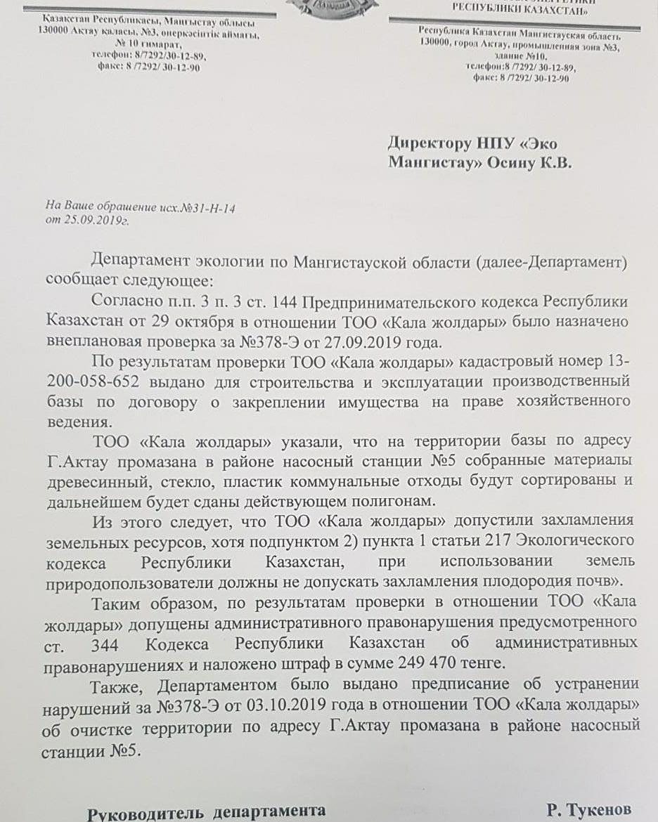 Ранее в Facebook на странице директора неправительственного учреждения «Эко Мангистау» Кирилла Осина, был опубликован ответ от департамента экологии о результатах проверки в отношении ТОО «Кала Жолдары».