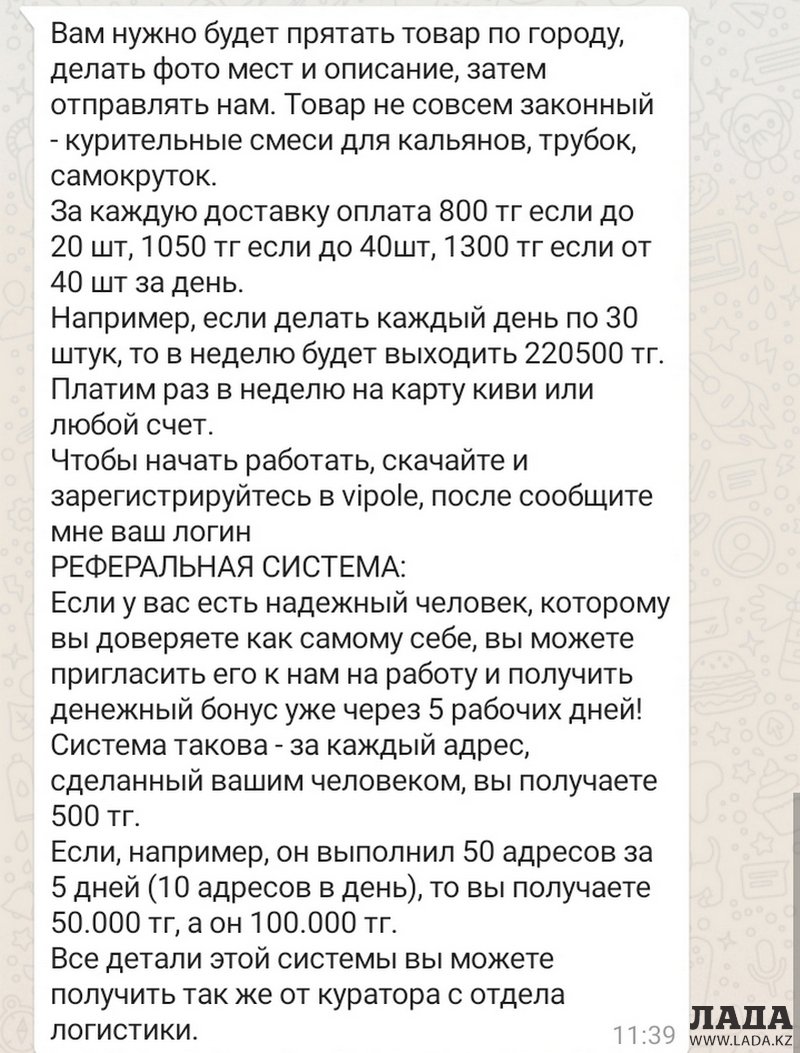 Работа заключается в распространении так называемых «закладок» с курительными смесями. Заработная плата в месяц, по словам организаторов наркобизнеса, составит 920 тысяч тенге.