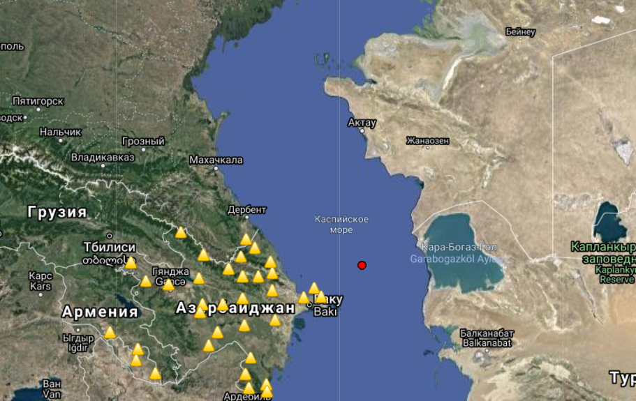 На глубине 42 километров в Каспийском море зафиксировали подземные толчки магнитудой 3,1 балла.