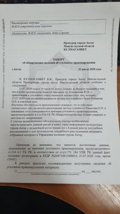 Со слов мужчины, он сразу же написал заявление в прокуратуру Актау. По факту незаконной эксгумации тела заведено уголовное дело по части 1 статьи 314 УК РК (Надругательство над телами умерших и местами их захоронения). В дальнейшем по факту совершённого преступления были проведены необходимые следственные действия.