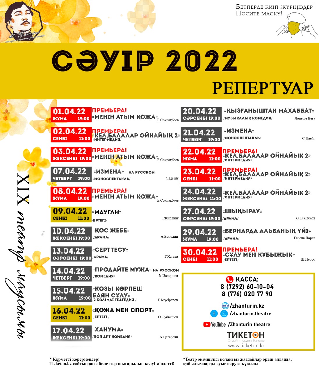Премьера спектакля пройдет 1 апреля в 19:00 в музыкально-драматическом театре имени Н.Жантурина. Также постановку можно будет увидеть в другие дни.