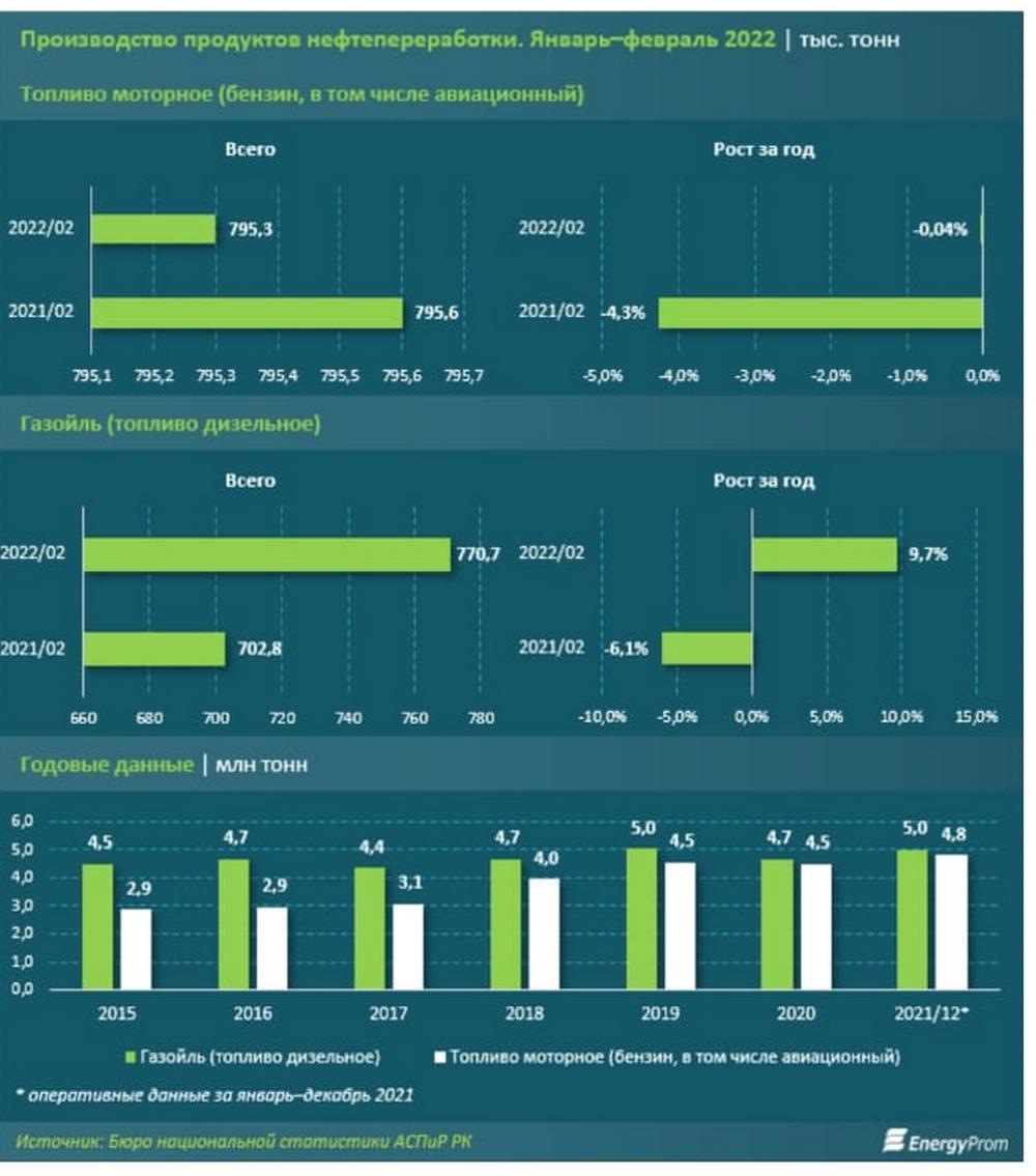 В целом за январь–декабрь 2021 года в стране произвели 4,8 миллиона тонн бензина и 5 миллионов тонн дизтоплива. Годовой рост выпуска бензина составил 7,1%, дизельного топлива - 6,7%. Впрочем, на цены в секторе могут повлиять авария на Каспийском трубопроводном консорциуме, геополитический кризис и санкционные удары по России.