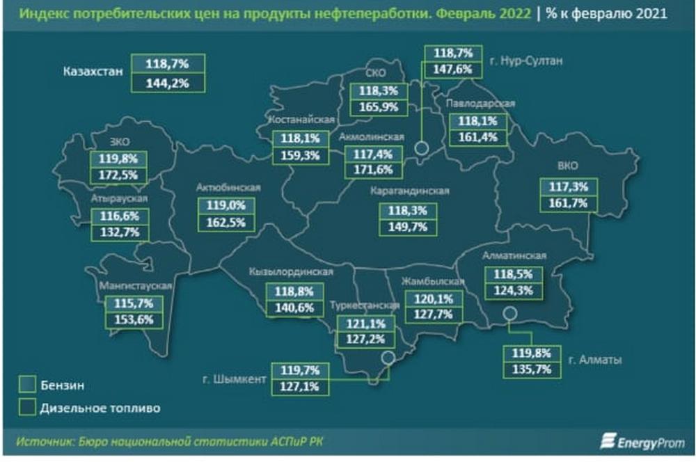 По росту цен на дизельное топливо антилидером стала Западно-Казахстанская область — плюс 72,5%. В тройку антилидеров также вошли Акмолинская и Северо-Казахстанская области. Наименьший годовой рост цен был зарегистрирован в Алматинской области — «всего» на 24,3%.