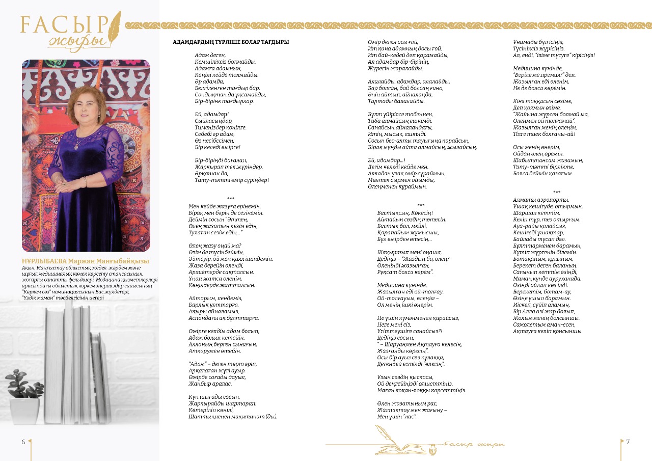 - Если коротко рассказать о своей работе в Скорой помощи, то фельдшер - это сложная и интересная профессия. А филология была моей мечтой в детстве. Помимо своей профессии, в свободное время люблю заниматься творчеством, в частности, писать стихи, - делится Маржан Нурлыбаева.