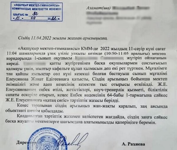 Мама первоклассницы школы-гимназии, расположенной в Акшукуре (14 километр), предоставила видеозапись, на кадрах которой видно, как женщина два раза ударяет бегущую по школьному коридору девочку по щеке. Инцидент, по заверению родительницы, произошел 11 апреля этого года. Сегодня же, 3 мая, мама школьницы получила ответ на свои заявления от директора школы и из департамента обеспечения качества образования региона.