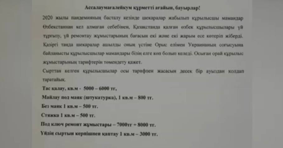 У кого они потребовали снижения цены? Кто будет снижать цену за свою работу с учетом того что все дорожает. За эти цены что они предлагают уважающие себя мастера не будут даже курятник делать. И сейчас цены в 10000-15000 тенге ремонт под ключ вызывает только интерес в качестве сделанной работы, а про дизайнерский ремонт там вообще и говорить не стоит там цена в 40000 и выше за метр квадратный. Сам по работаю в этой сфере и не по наслышке знаю цены на качественный ремонт.