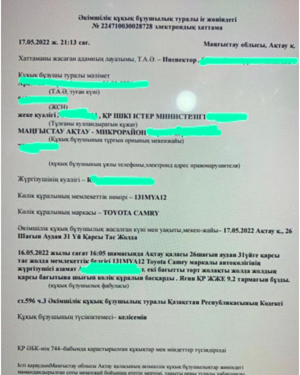 По данному факту, как сообщили в департаменте полиции, на 26-летнего водителя, нарушившего правила дорожного движения, составлен протокол по части 3 статьи 596 Кодекса об Административных Правонарушениях РК (Выезд на сторону проезжей части дороги, предназначенную для встречного движения, в случаях, если это запрещено правилами дорожного движения, в том числе сопряженный с разворотом или поворотом).