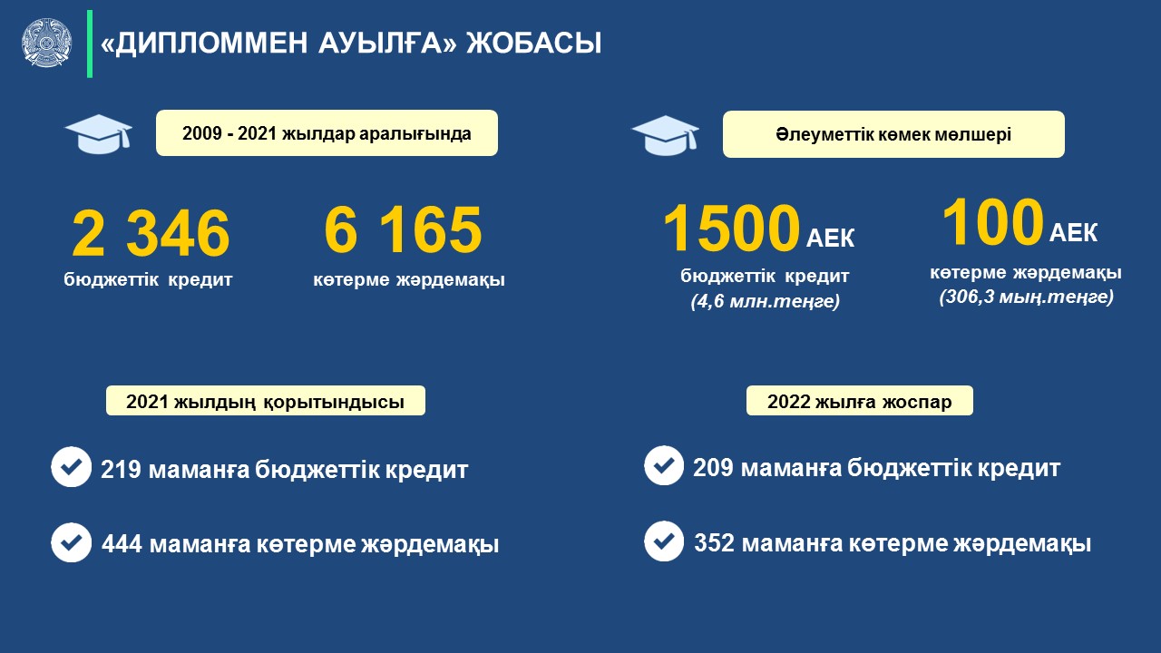 По словам заместителя руководителя управления экономики и бюджетного планирования Куаныша Балжанова, для работы и проживания в селах молодежи выдается подъемное пособие в размере 100 МРП и кредит на приобретение или строительство жилья в размере не более 1500 МРП. То есть, специалист для этой цели может получить 4 594 500 тенге.