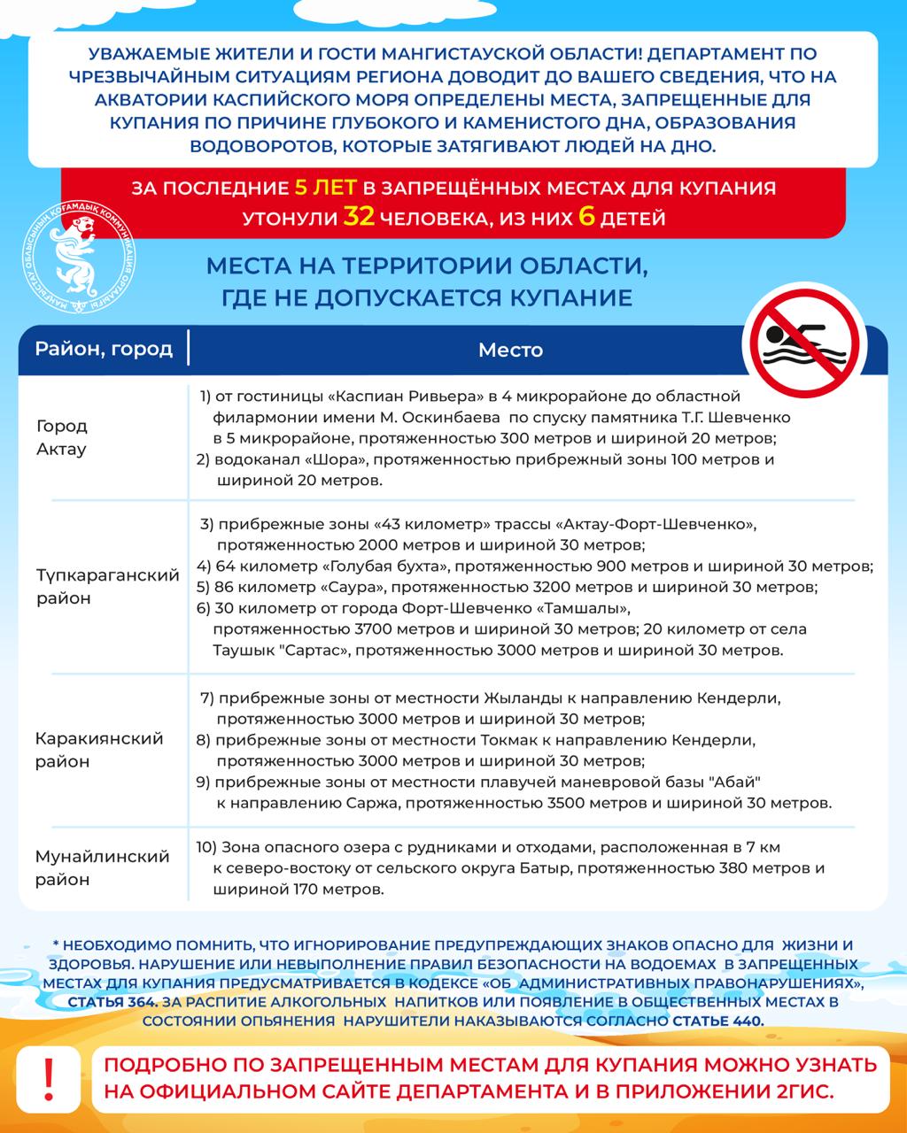 В число запрещенных для купания мест в Актау попали две зоны. Под запретом участок от гостиницы «Каспиан Ривьера» в 4 микрорайоне и до областной филармонии имени М.Оскинбаева, к спуску от памятника Тарасу Шевченко в 5 микрорайоне, протяжённостью 300 метров и шириной 20 метров.