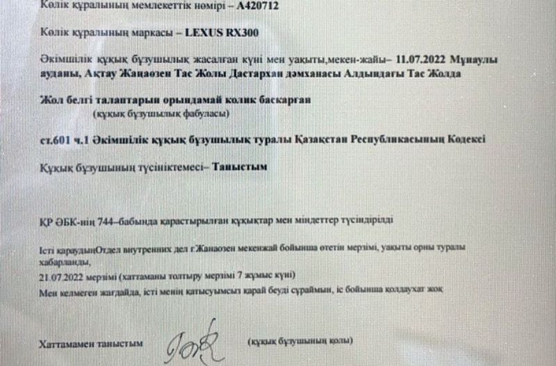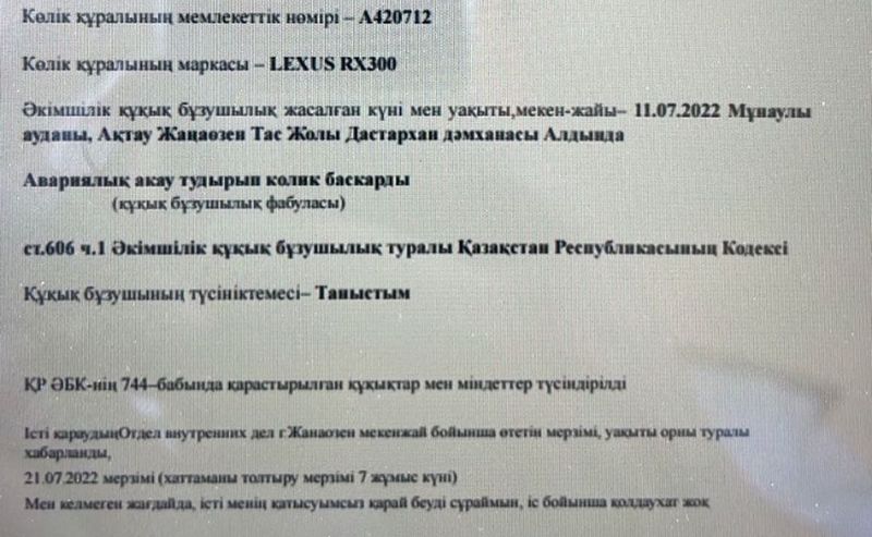 На нарушителя ПДД - водителя Lexus RX 300 стражи порядка составили протоколы по части 1 статьи 601 КоАП РК (Несоблюдение требований, предписанных дорожными знаками или разметкой проезжей части дороги) и части 1 статьи 606 КоАП РК (Нарушение участником дорожного движения правил дорожного движения, повлекшее создание аварийной обстановки, то есть вынудившее других участников движения резко изменить скорость, направление движения).