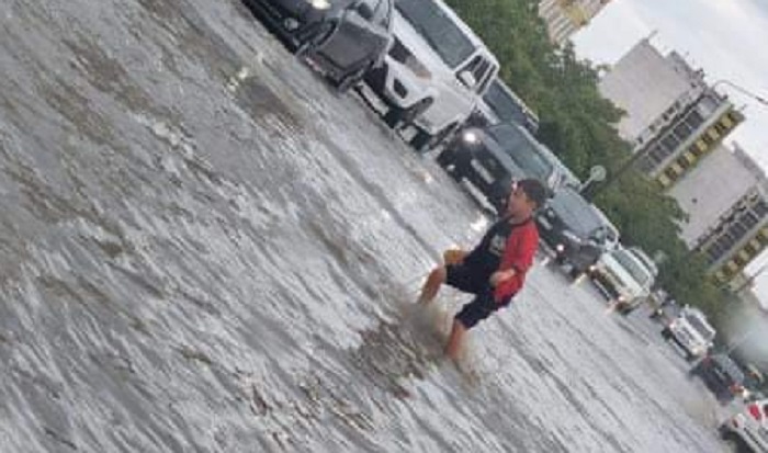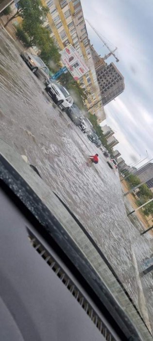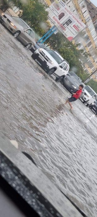 На кадрах фото мальчик, который искал свою обувь. Со слов автора фотографий, ребёнок потерял обувь, когда переходил затопленную после дождя дорогу.