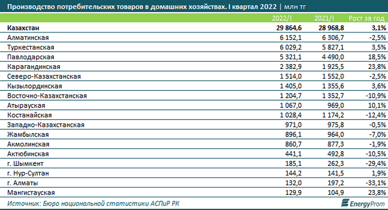 Меньше всего собственной продукции произвели в Мангистауской области - 129,9 миллиона тенге. При этом на 23,8 процента больше, чем за первый квартал в 2021 году.