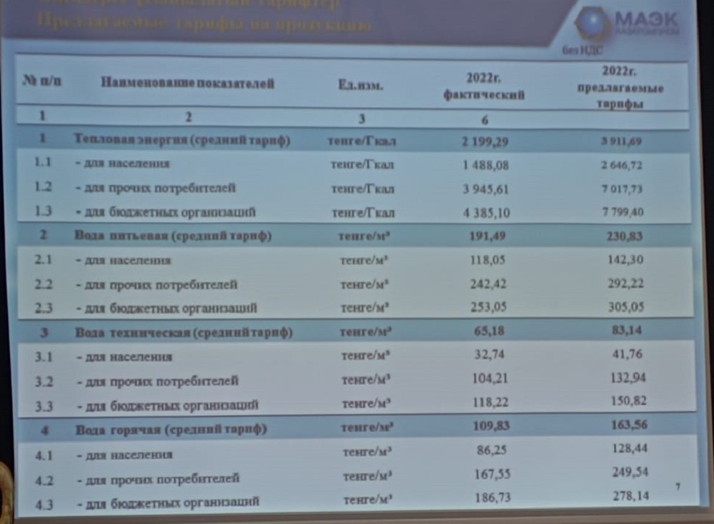 - Первое - это изменение тарифа на газ, и второе - это изменение стоимости на производство электроэнергии. ТОО «МАЭК-Казатомпром» на сегодняшний день является таким сложным технологическим предприятием, которое производит электроэнергию, воду и теплоэнергию. Для того, чтобы производить воду, нужна электроэнергия. Электроэнергия подорожала, подорожал газ, эти стратегические товары и являются основанием в соответствии с законом о естественных монополиях для рассмотрения изменения тарифов. Вы видели проект тарифов, я сразу скажу, таких тарифов не будет. Это их предложение, мы будем заходить внутрь проектной сметы и смотреть все затраты. Мы, как уполномоченный орган, будем рассматривать законное обоснование, - сказал Жандос Салимов.
