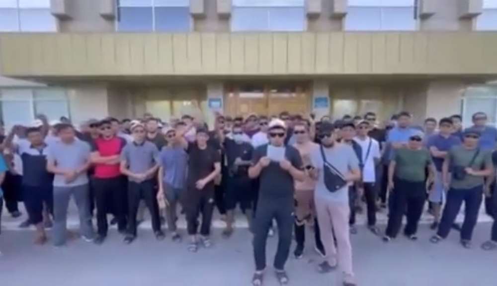 Несколько десятков безработных мужчин собрались у здания акимата Жанаозена и записали видеообращение.