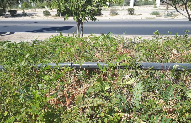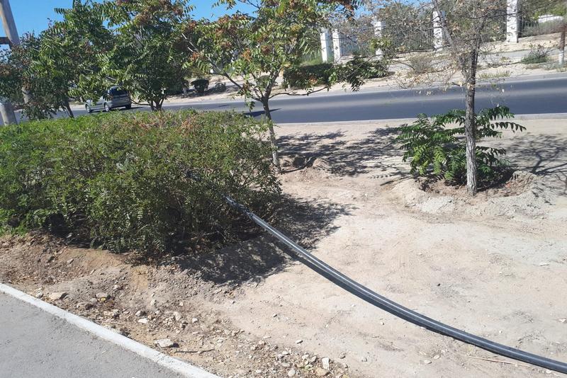 По словам местной жительницы Айгерим, озеленители провели поливочный шланг прямо по кустарникам вдоль тротуара, напротив торгового центра «Сауле» в 8 микрорайоне.