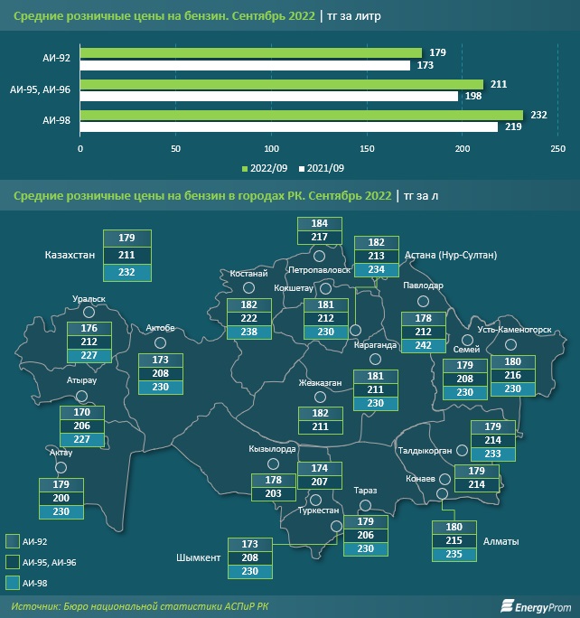 Самый дорогой бензин марки АИ-92 продавался в Петропавловске - 184 тенге за литр, Астане - 182 тенге за литр, такая же цена и в Жезказгане, Костанае. Жителям Актау топливо обходится за 179 тенге за литр.