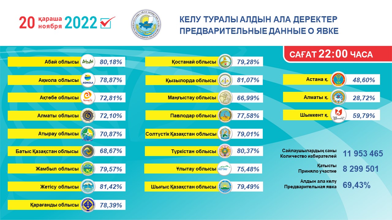 В соответствии с границами часовых поясов на территории Республики в пяти регионах (Актюбинская, Атырауская, Западно-Казахстанская, Кызылординская и Мангистауская области) голосование было завершено в 21.00 час по времени столицы.