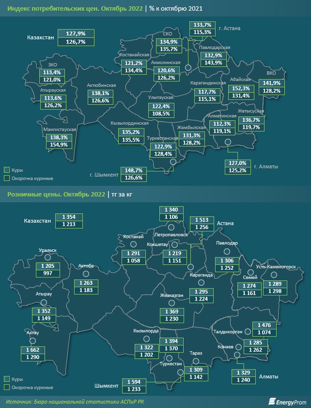 Сильнее всего удорожание кур ощутили жители Абайской области — на 52,3 процента за год. В тройке антилидеров также оказались Шымкент (плюс 48,7 процента) и Восточно-Казахстанская область (плюс 41,9 процента). Наименьший рост цен был зарегистрирован в Алматинской области: «всего» на 12,3 процента.