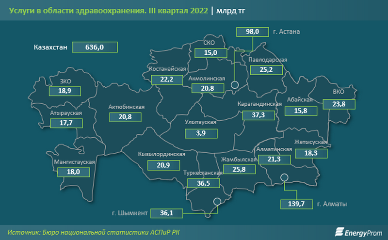 По данным проекта по мониторингу экономики Казахстана в формате рэнкингов, в третьем квартале 2022 года услуги в области здравоохранения в денежном выражении составили 636 миллиардов тенге. Это практически столько же, сколько и в аналогичном периоде прошлого года.