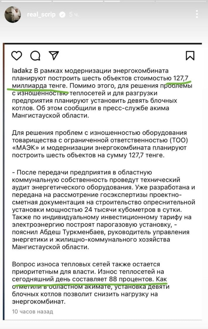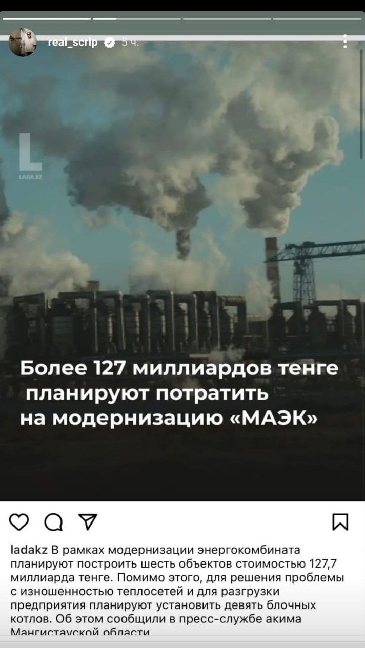 Сегодня, 21 декабря, музыкант опубликовал на своей странице скриншот с информацией о том, что более 127 миллиардов тенге планируют потратить на модернизацию «МАЭК».