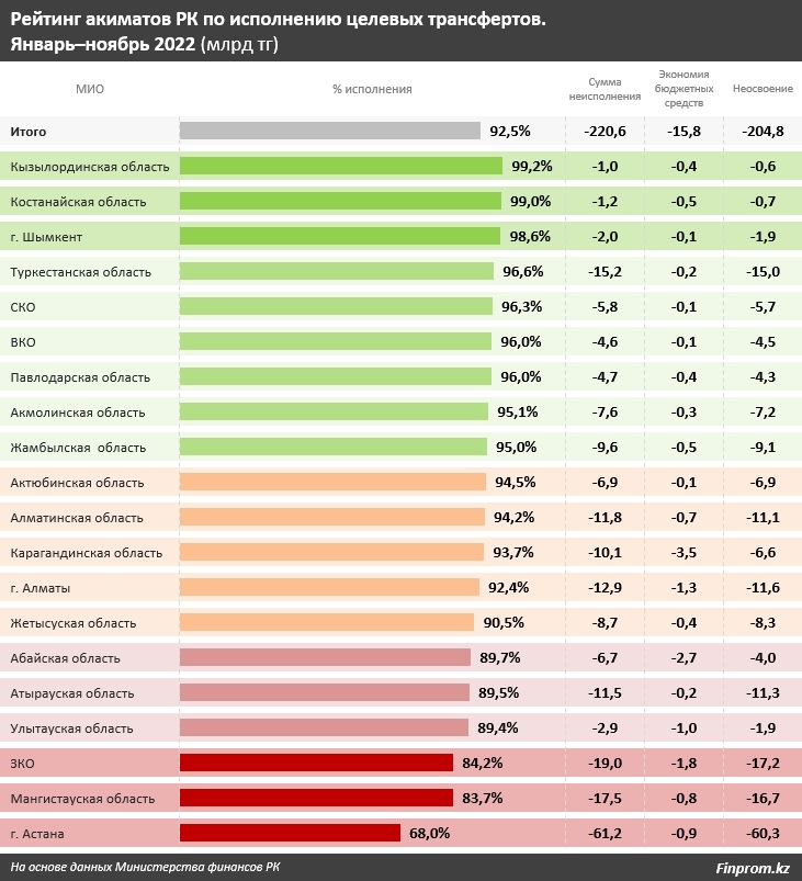 За январь–ноябрь 2022 года акиматам городов и областей страны было выделено 2,9 триллиона тенге целевых трансфертов, при этом исполнены были только 92,5 процента всех средств. Неисполненная сумма составила 220,6 миллиарда тенге, из которой экономия средств составляет всего 15,8 миллиарда тенге, а сумма неосвоенных средств - сразу 204,8 миллиарда тенге.