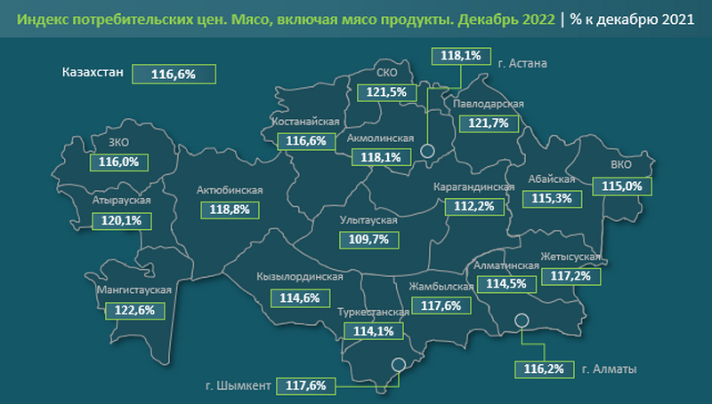 По данным проекта по мониторингу экономики Казахстана в формате рэнкингов, стоимость мяса и птицы в стране выросла на 15 процентов, колбасной продукции - на 22 процента.