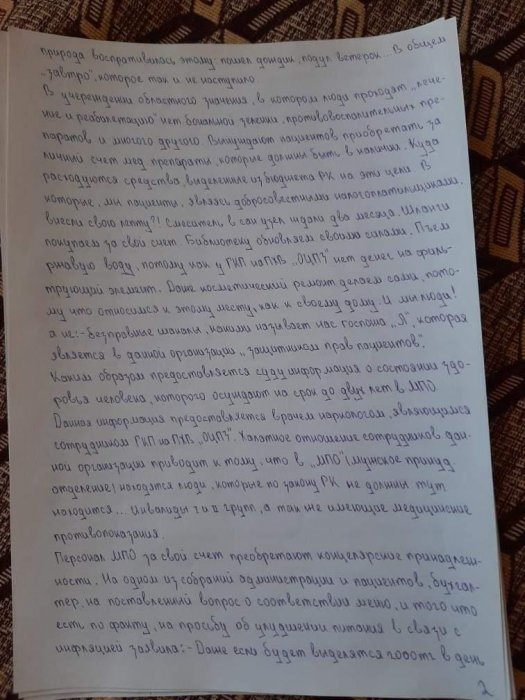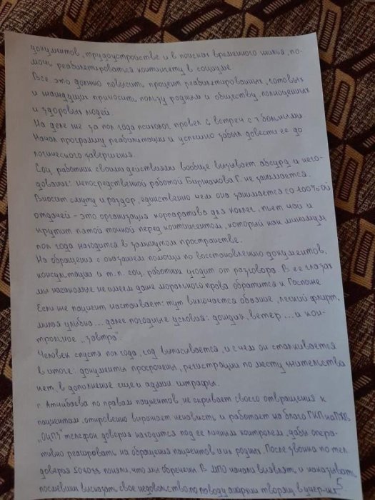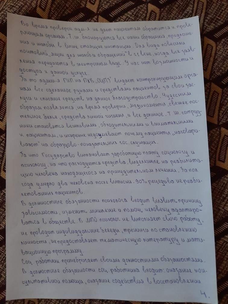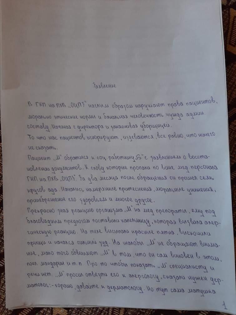 - В учреждении наглым образом нарушают права пациентов, моральные и этические нормы, и банальная человечность чужда административному составу, начиная от директора и заканчивая уборщицей. То, что нас игнорируют, издеваются, всё равно, что ничего не сказать. Пациент М. обратился к социальному работнику Б. с заявлением о восстановлении документов, которые, к слову, пропали по вине медперсонала центра здоровья. За два месяца после обращения он прошёл семь кругов ада. Начались намеренные притеснения, моральные унижения, пренебрежение его здоровьем и многое другое. Прекрасно зная реакцию организма М. на медпрепарат, ему под благовидным предлогом поставили капельницу, которая вызвала аллергическую реакцию. На теле высыпали красные пятна, – говорится в заявлении пациентов.