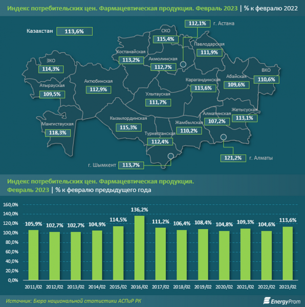 В региональном разрезе годовое удорожание фармацевтической продукции по итогам февраля текущего года варьировалось от 7,2 процента в Алматинской области до 21,2 процента в Алматы.