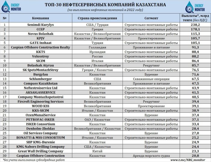 - Указанные топ-30 компаний выполнили нефтяникам работы в 2022 году на два триллиона тенге (без учета НДС),- отмечают аналитики.