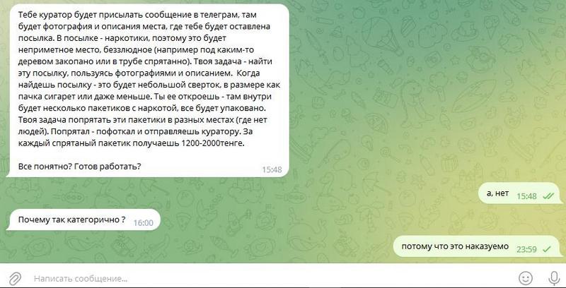 - В основном предлагают от 200 до 400 тысяч тенге за неделю. Это нереально. Узнаешь, а там оказывается нужно делать «закладки» с синтетическими наркотиками. Такие заоблачные суммы вскружат головы молодых, еще не окрепших умов. А это же уголовная статья. Нужно с этим что-то решать, - говорит местный житель Самир.