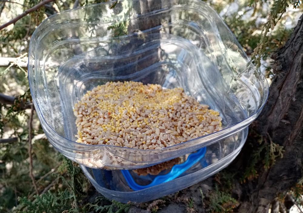 В кормушке были насыпаны зерна пшеницы и пшенная крупа. Спустя пару минут сюда слетелись воробьи.