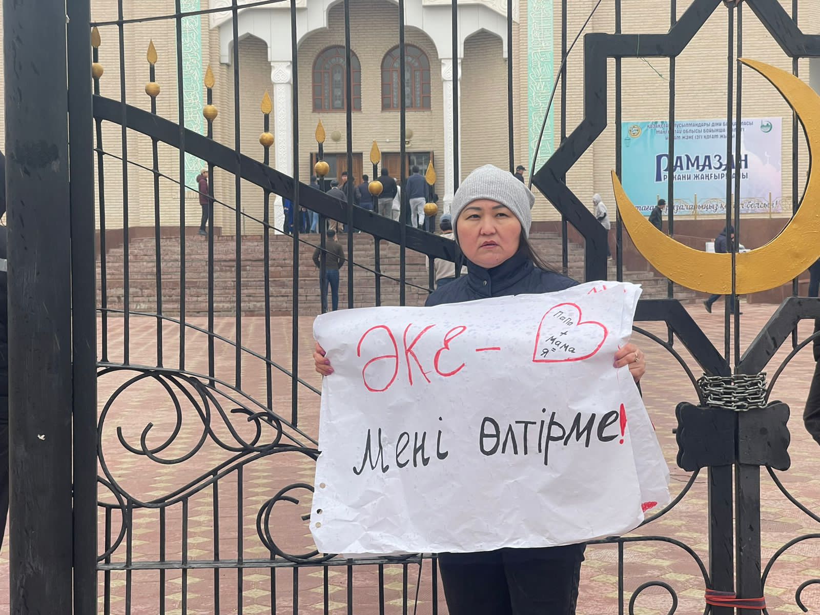 У мечети в Актау 31 марта представители общественности Мангистауской области вышли на улицу с плакатами, на которых были написаны лозунги с призывами остановить бытовое насилие.
