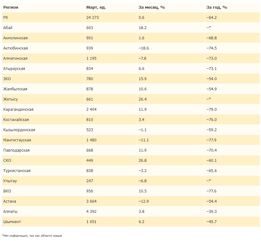Меньше всего сделок оформили в марте в области Улытау (247), СКО (449), Кызылординской области (523).