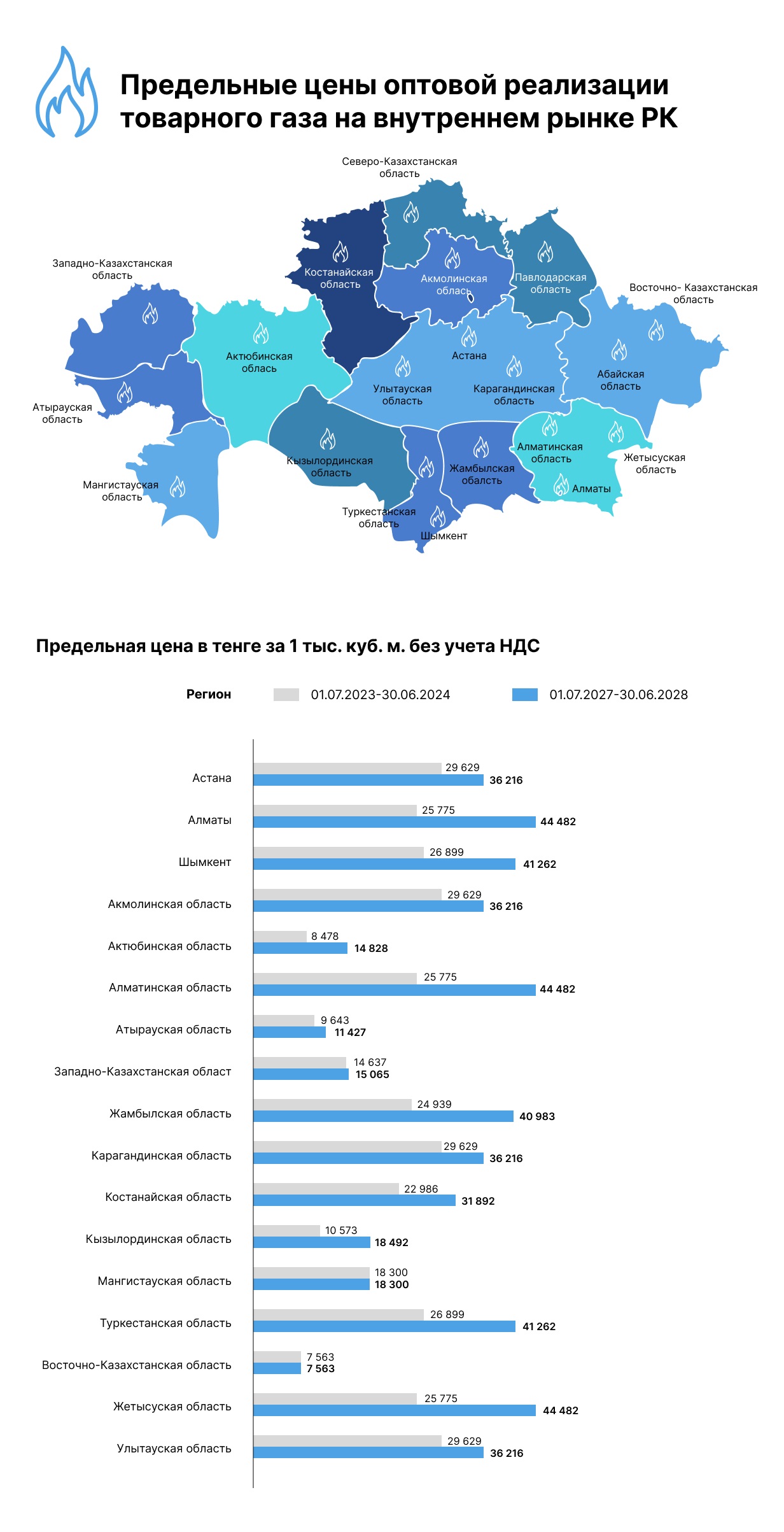 В Атырауской области предельная цена на газ составляет 9643 тенге за тысячу кубических метров, и к лету 2028 года она вырастет до 11 427 тенге.