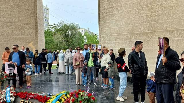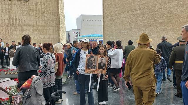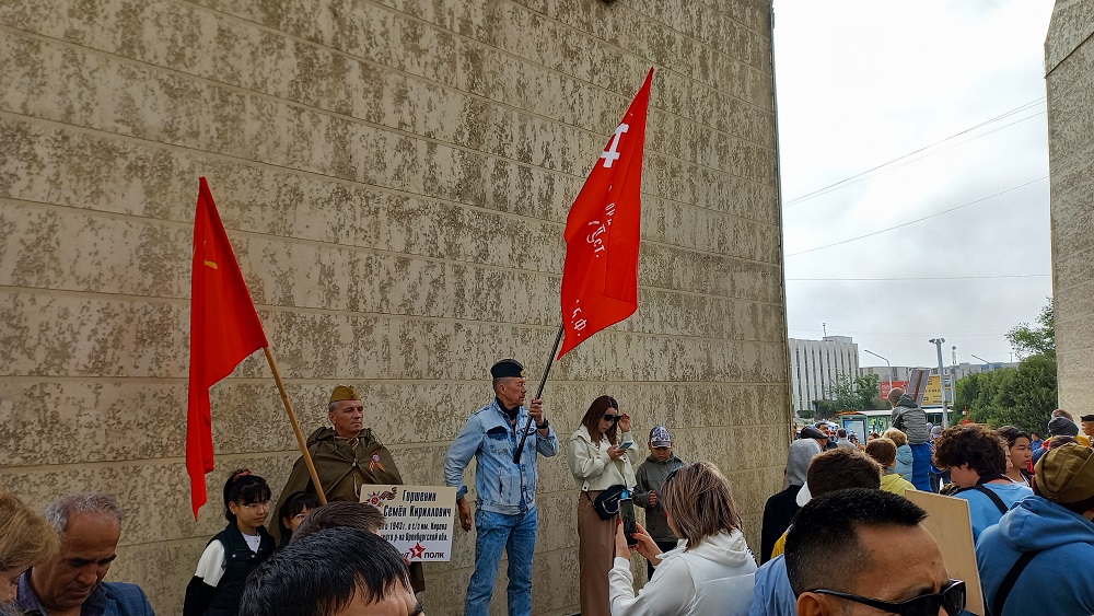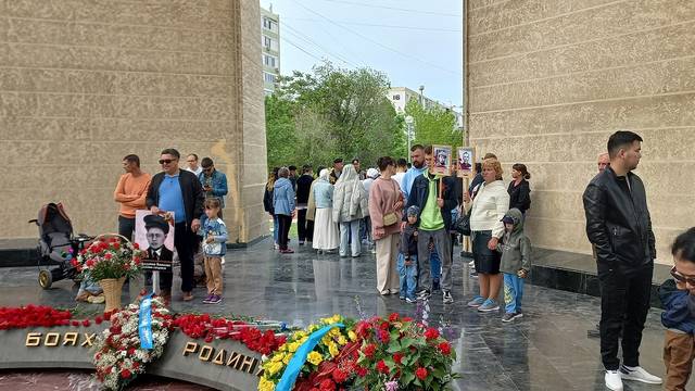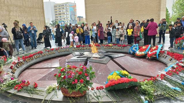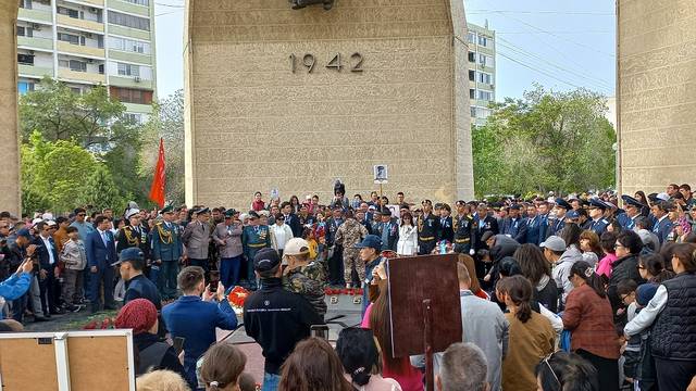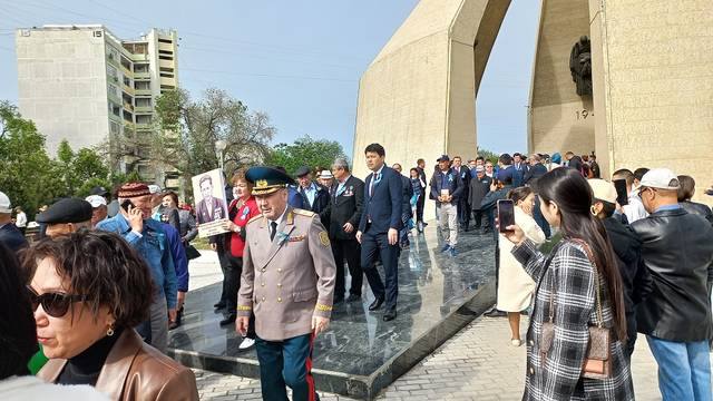 В церемонии возложения цветов также приняли участие аким области, военнослужащие и многие другие. Люди приходили с портретами своих родных, участвовавших в Великой Отечественной войне.