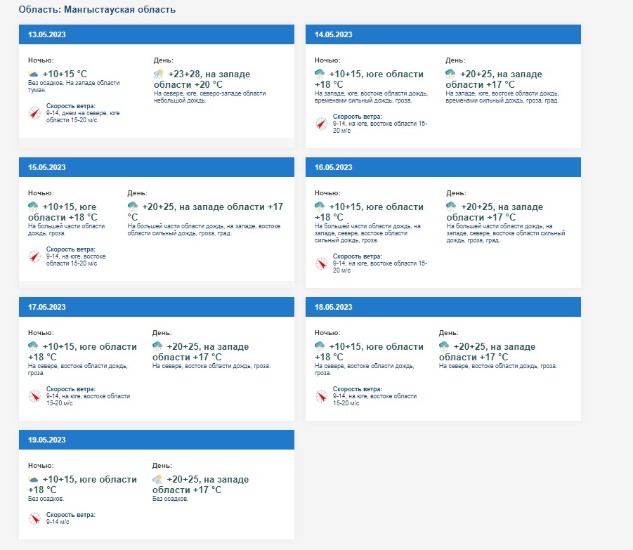 Согласно прогнозам специалистов РГП «Казгидромет», до 19 мая в Мангистау прогнозируется преимущественно дождливая погода – пройдут кратковременные дожди с грозами, порывистым ветром, градом и грозой.