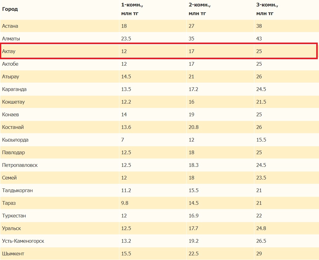 - Остальные 13 городов в середине рейтинга. Это Актау, Актобе, Семей, Туркестан, Кокшетау, Уральск, Павлодар, Петропавловск, Усть-Каменогорск, Караганда, Костанай, Конаев, Атырау. Здесь цены от 12 миллионов тенге за однокомнатные до 26,5 миллиона за трёхкомнатные, - сообщает сайт.