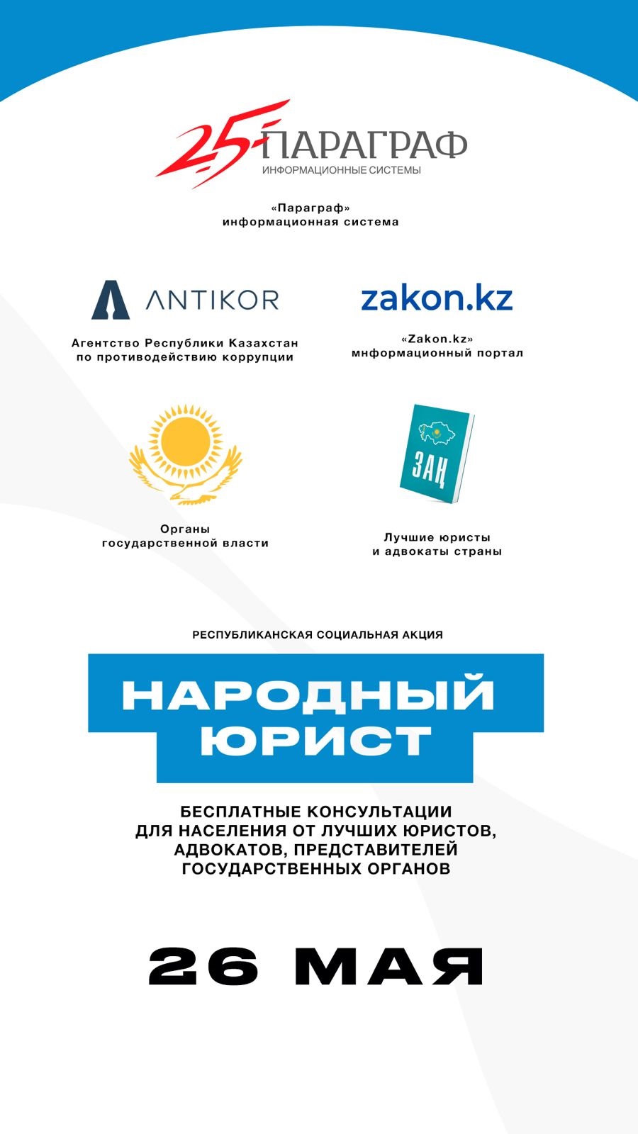 Общереспубликанская социальная акция «Народный юрист» организована Агентством РК по противодействию коррупции сетевым изданием Zakon.kz, информационной системой «Параграф», государственными органами, ведущими юристами и адвокатами страны.
